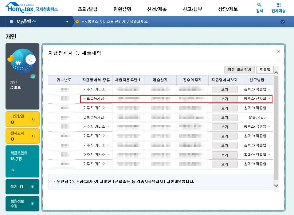 이런 문제를 해결하기 위해 이전 직장에 연락을 하지 않고 홈택스에서 '근로소득원천징수영수증'을 출력이 가능하도록 지원하고 있습니다.