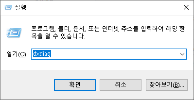 여기서 열기 옆에 있는 공란에 'dxdiag'를 입력하신 다음에 '확인' 버튼을 눌러주시면 되겠습니다.