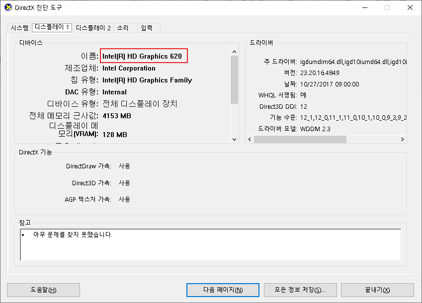 외장 그래픽 카드를 연결하신 분들은 연결한 그래픽카드의 모델이 그대로 나와 있기 때문에 저와 다르게 표시가 될 것입니다.