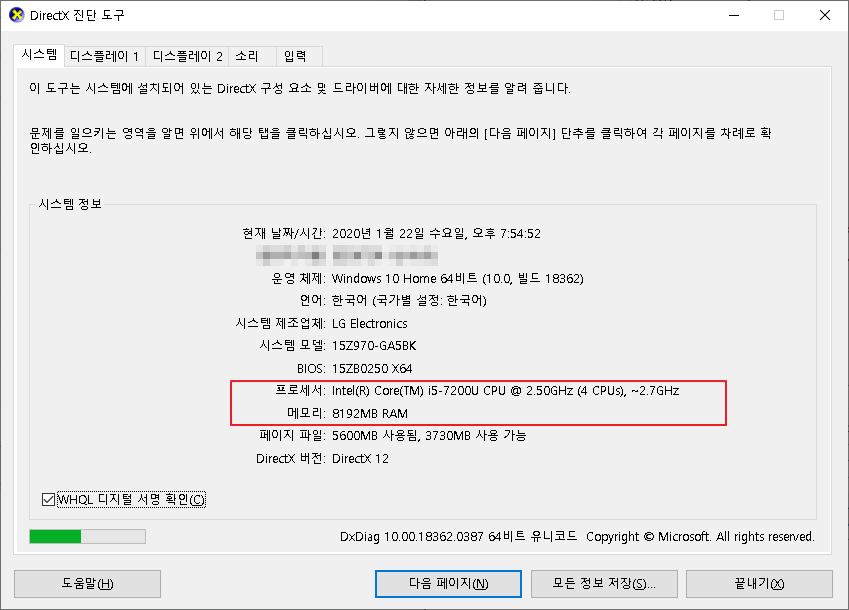 현재 저는 프로세서(CPU)가 'Inter(R) Core(TM) i5-7200U CPU'를 사용하고 있으며,