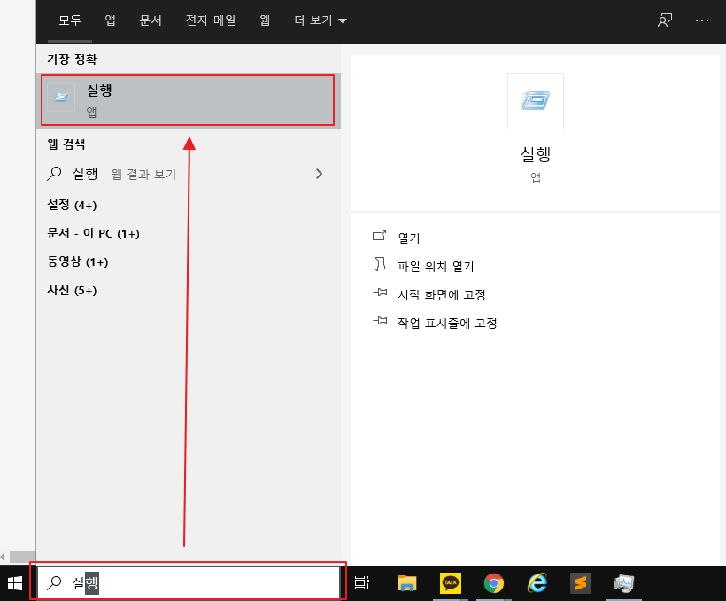 우선 내 바탕화면 왼쪽 아래에 있는 '검색하려면 여기에 입력하십시오.' 라고 보이는 부분을 클릭해서 아래와 같이 '실행' 이라고 입력해주시면 위에 '실행 앱'을 찾을 수 있습니다.