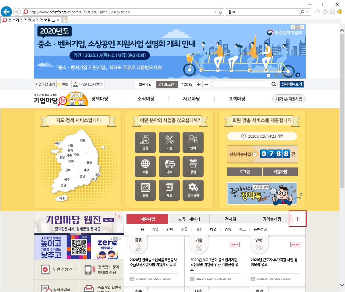 페이지를 이동해 기업마당 홈페이지로 들어가시면 노란색 띠 아래쪽에 '지원사업, 교육/세미나, 전시회, 정책브리핑 ... 등' 이 나와있는 창이 보이는데, 여기서 + 버튼을 눌러서 다시 이동해주시면 되겠습니다.