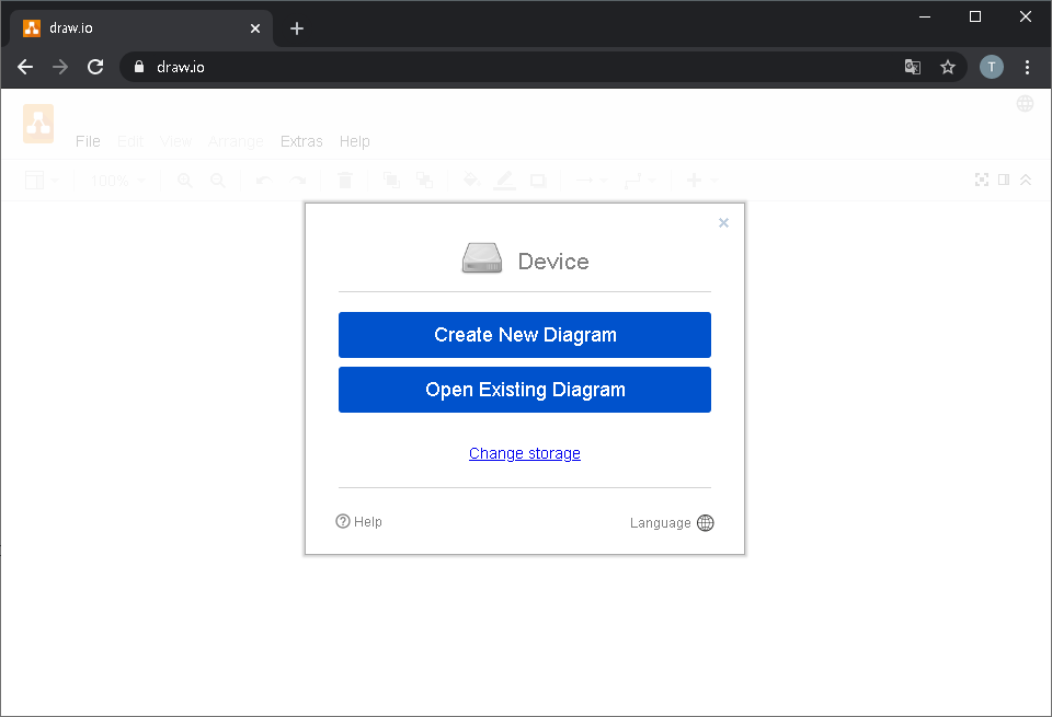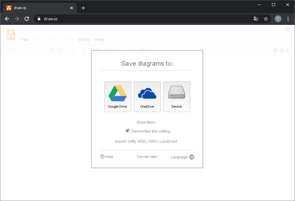 첫 페이지에서는 다이어그램을 어디에 저장을 할지에 대한 선택을 하는 알림창을 바로 확인할 수 있습니다.