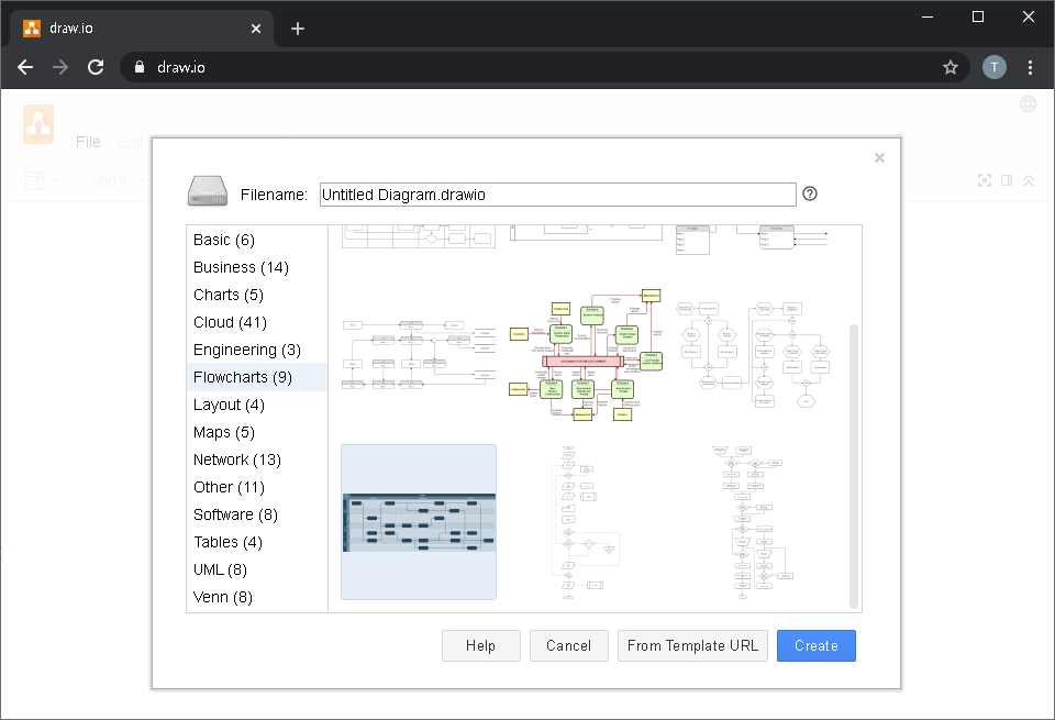 위의 새 다이어그램 생성하는 옵션을 선택하게 되면 기본적으로 웹사이트에서 제공되는 다이어그램의 형태를 고를 수 있습니다.