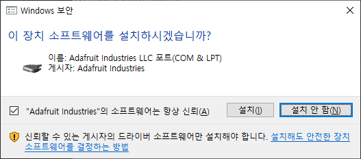 설치 후반에 나타나는 COM 포트 드라이버 설치 여부를 묻는 안내창에서는 [설치] 버튼을 클릭