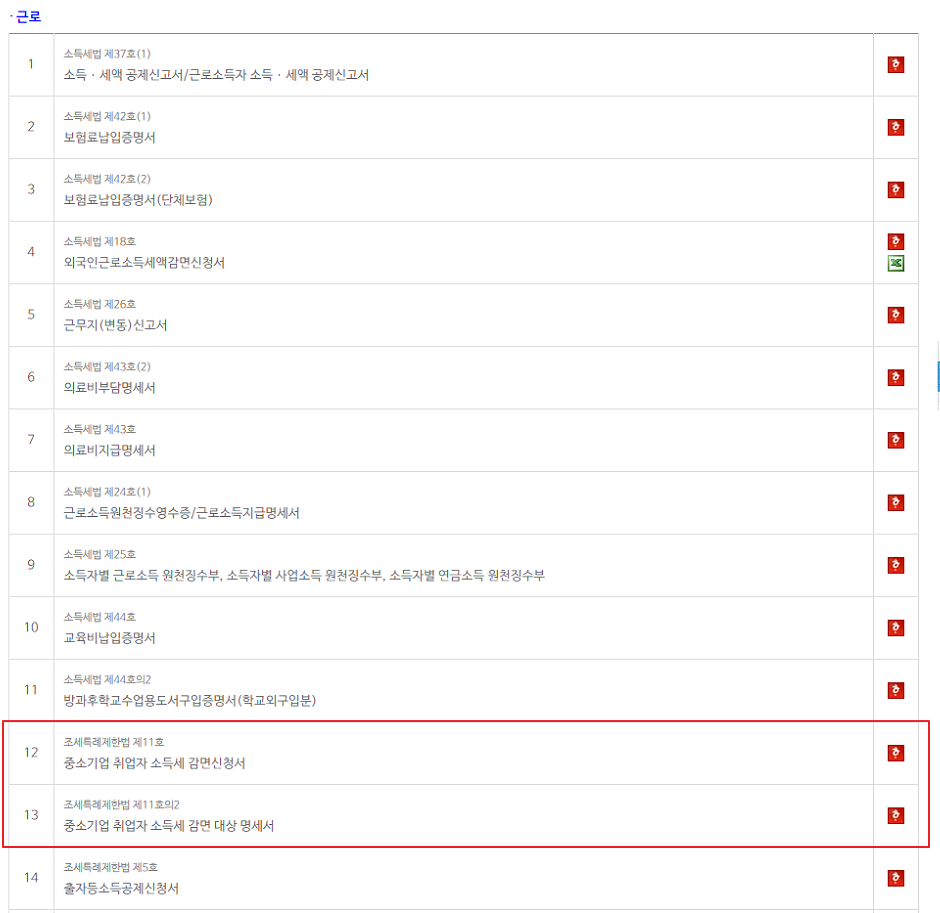 페이지를 아래로 내리면 '근로' 항목에 12번 '중소기업 취업자 소득세 감면신청서'와 13번 파일 '중소기업 취업자 소득세 감면 대상 명세서'를 다운로드 받아 주시면 되겠습니다.