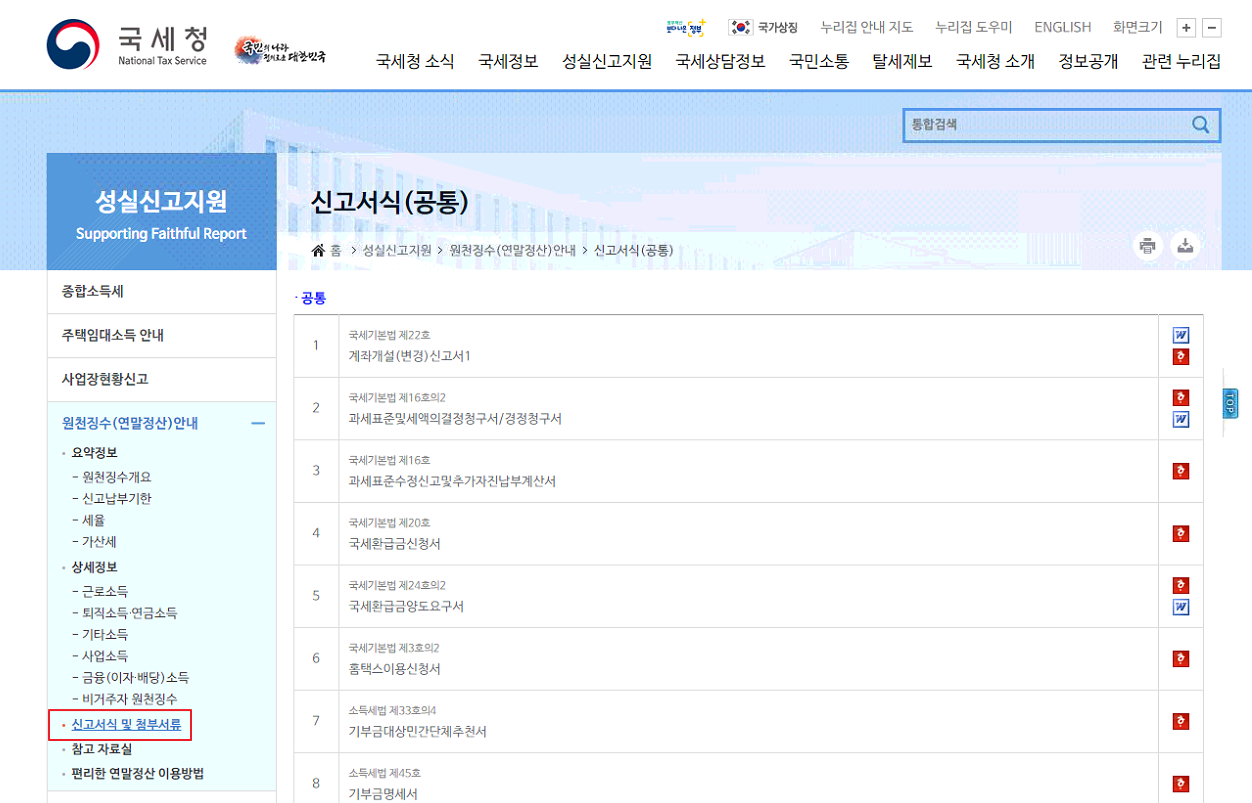 이동한 페이지에서 좌측에 있는 '신고서식 및 첨부서류' 버튼을 눌러주시면 오른쪽 화면에 굉장히 많은 첨부 파일을 찾을 수 있습니다.