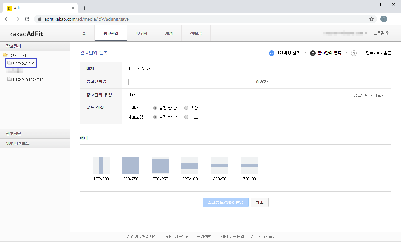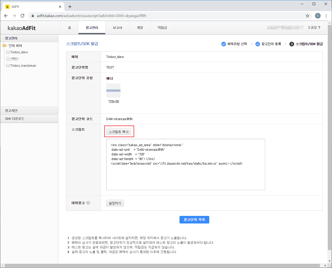 그럼 여기에 코드를 넣어주기 위해서 카카오 애드핏 홈페이지로 돌아오시면 되겠습니다.