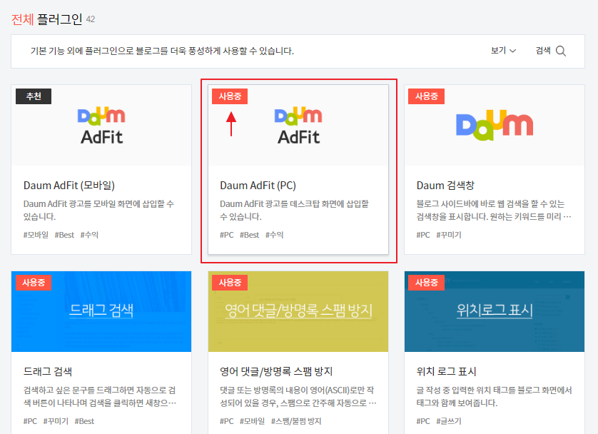 적용 버튼을 누르게 되면 다음과 같이 기존 '추천'으로 되어 있는 플러그인이 '사용중'으로 변경되게 되면서 내 모든 포스팅에 지정한 위치로 광고가 표시되게 됩니다.