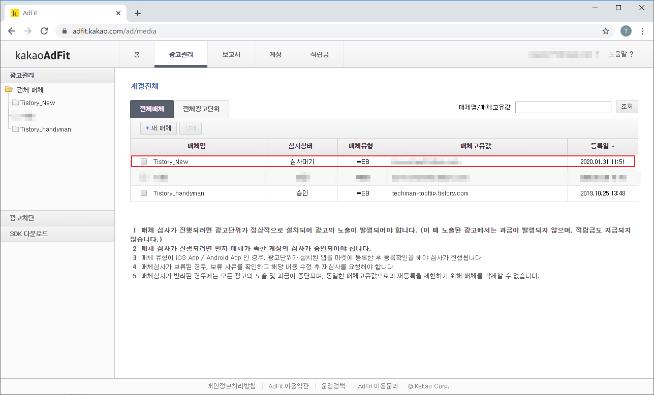 확인을 하기 위해 처음 눌렀었던 '광고관리' 버튼을 다시 한 번 눌러보게 되면 매체에 등록된 것을 확인하실 수 있으십니다.