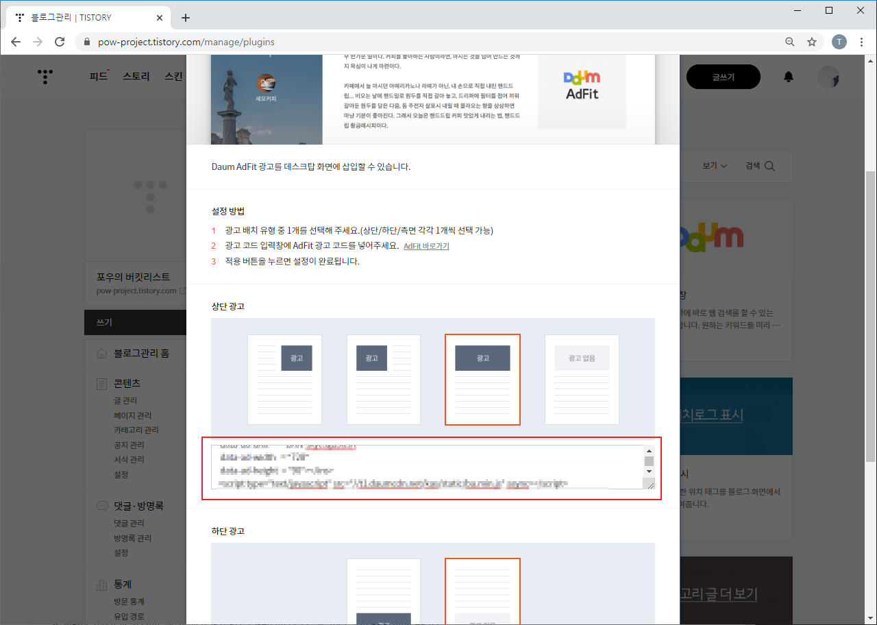 그러면 다시 블로그 설정 페이지로 돌아와서 아까 그 플러그인 화면에서 PC 광고를 넣기 위해 광고 스크립트 입력 란에 해당 내용을 복사해주시면 되겠습니다.