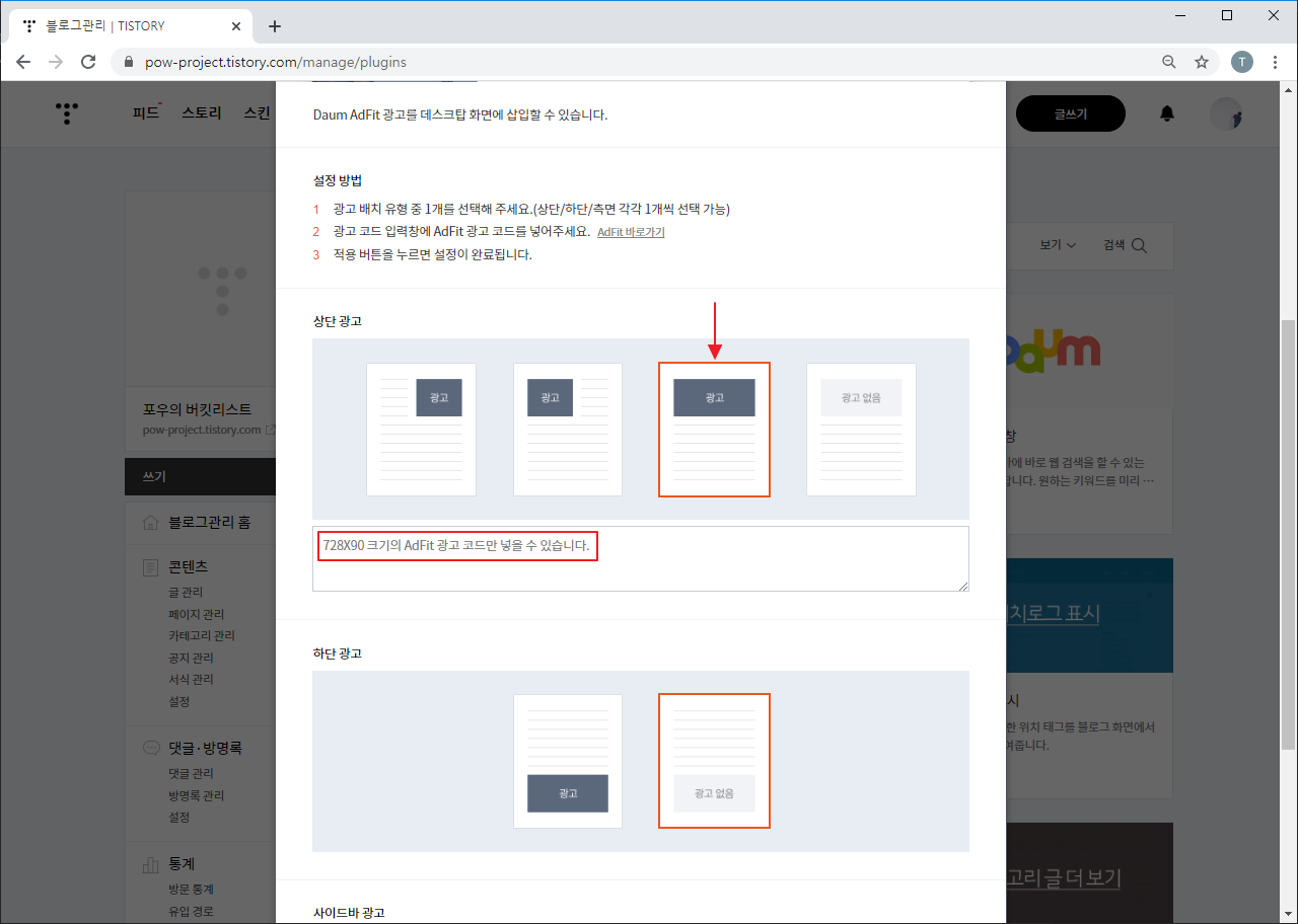 여기서 'Daum AdFit (PC)' 버튼을 누르고 나타나는 창에서 스크롤을 아래로 내려보게 되면 다음과 같이 광고 위치와 크기를 정할 수 있습니다.