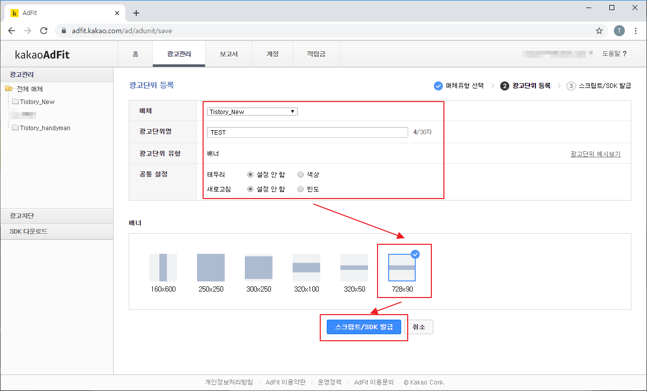 일단 매체를 선택하는 곳에서는 추가한 블로그를 선택해 주시고, 광고단위명은 내가 알아볼 수 있게 선택해주시면 됩니다. 지금은 TEST로 입력했지만 저는 보통 '블로그명_광고사이즈'로 이름을 지정하는 편입니다.