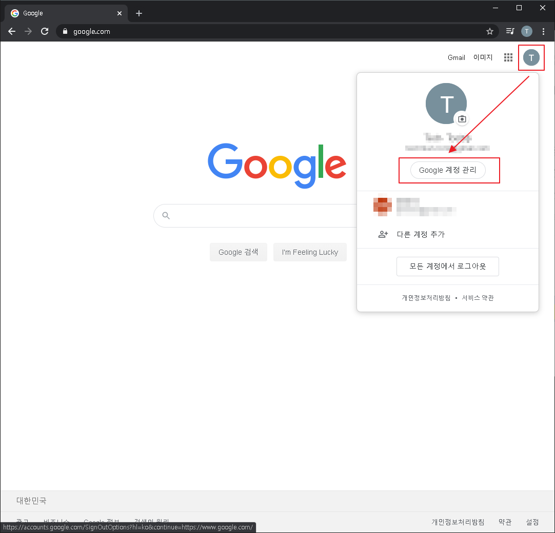 실행한 구글 웹페이지에서 스마트폰에서 로그인한 계정과 동일한 구글 계정을 로그인해주시고, 오른쪽 상단의 계정 아이콘을 눌러주게 되면 다음과 같은 페이지가 나타나게 됩니다.