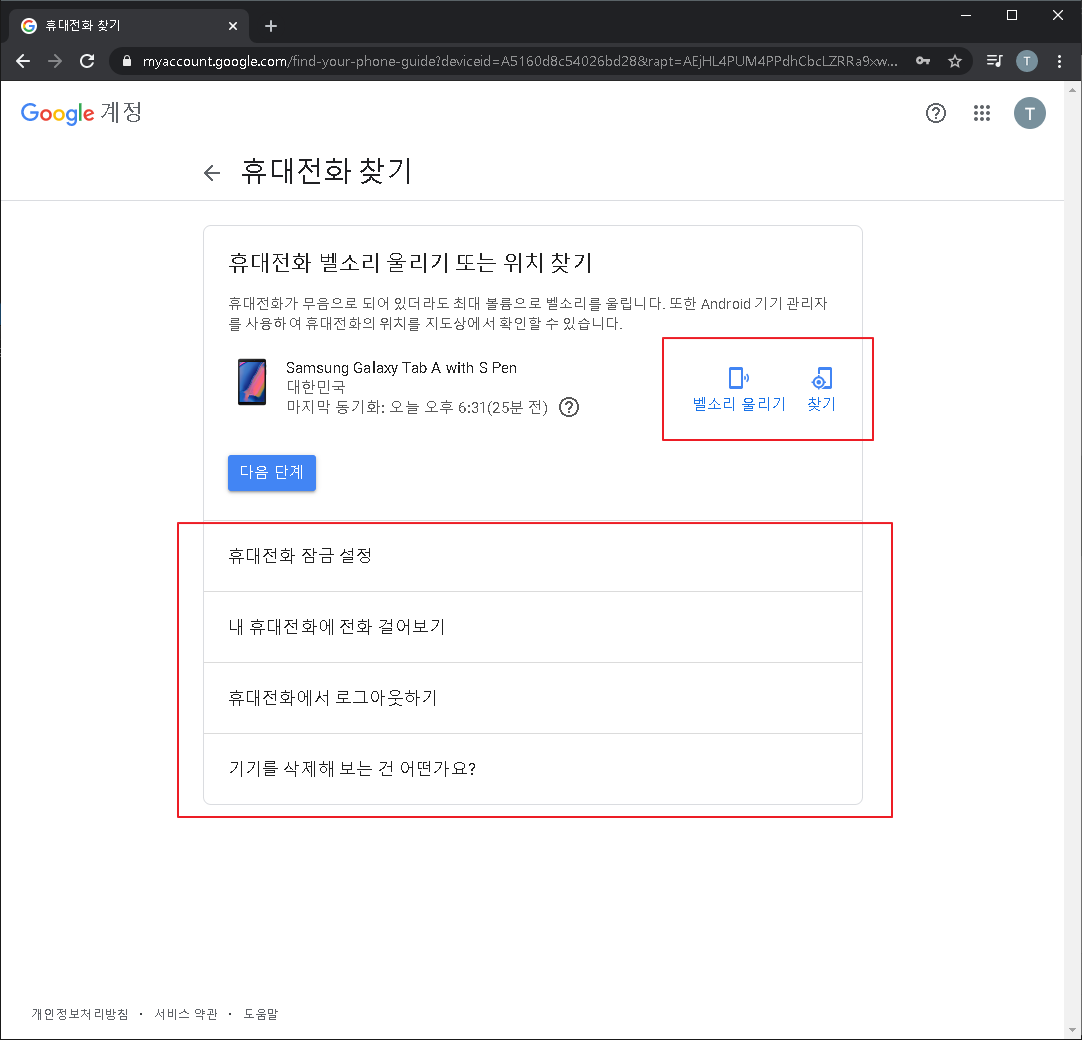 여기서 아래 빨간 네모 상자 안에 있는 버튼들이 내 휴대폰을 찾을 수 있는 기능 또는 잃어버린 휴대폰에 대해서 잠금을 할 수 있는 기능들을 지원하는 버튼입니다.