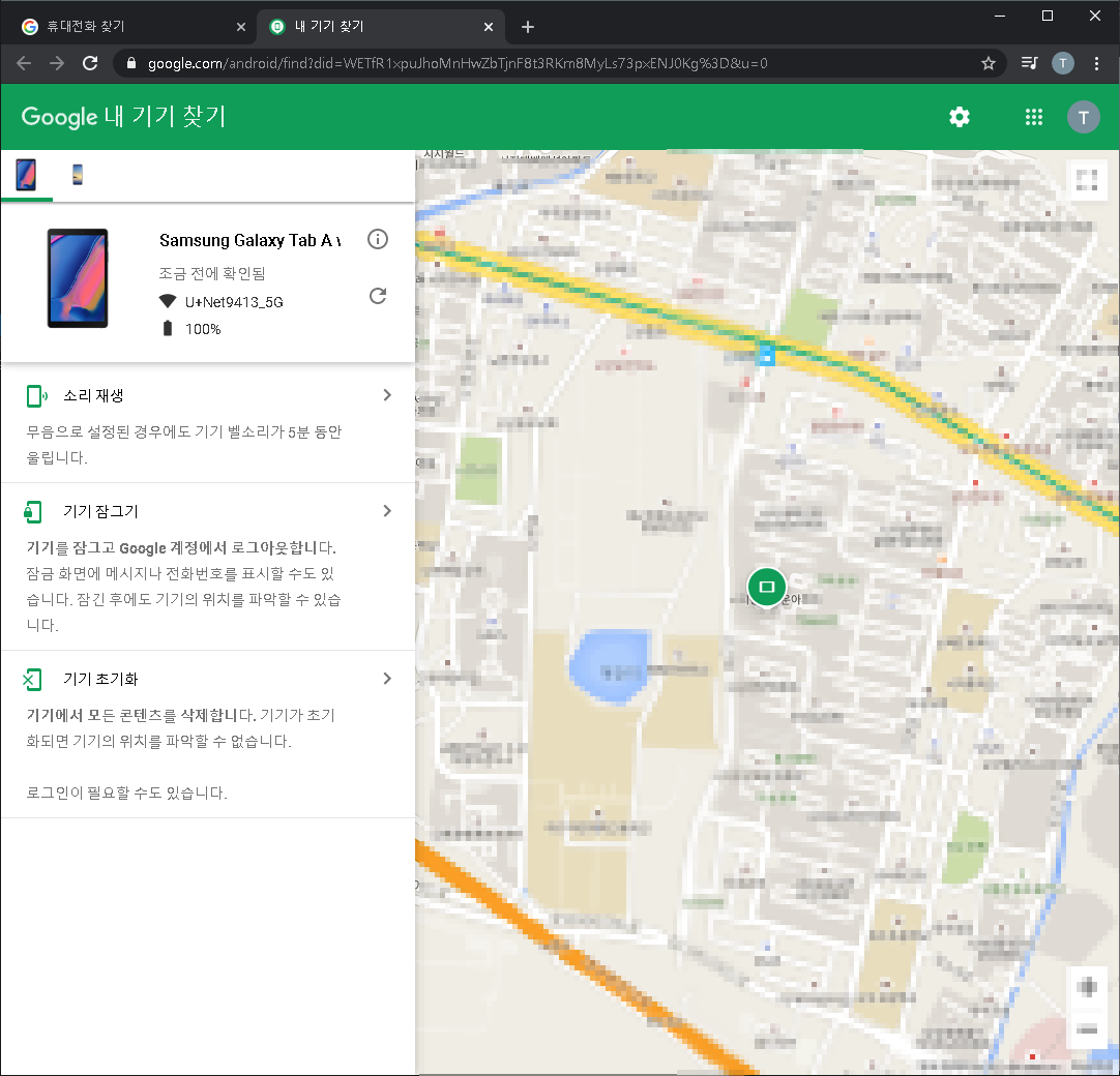 '찾기' 버튼을 누르면 다음화면에서 처럼 내 기기의 위치 정보를 확인할 수 있습니다.