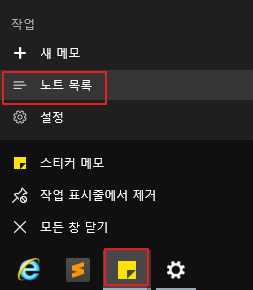 노트 목록은 작업 표시줄에 있는 스티커 메모에서 우클릭을 한 뒤에 '노트 목록'을 누르게 되면 입력한 노트의 목록들을 확인할 수 있습니다.