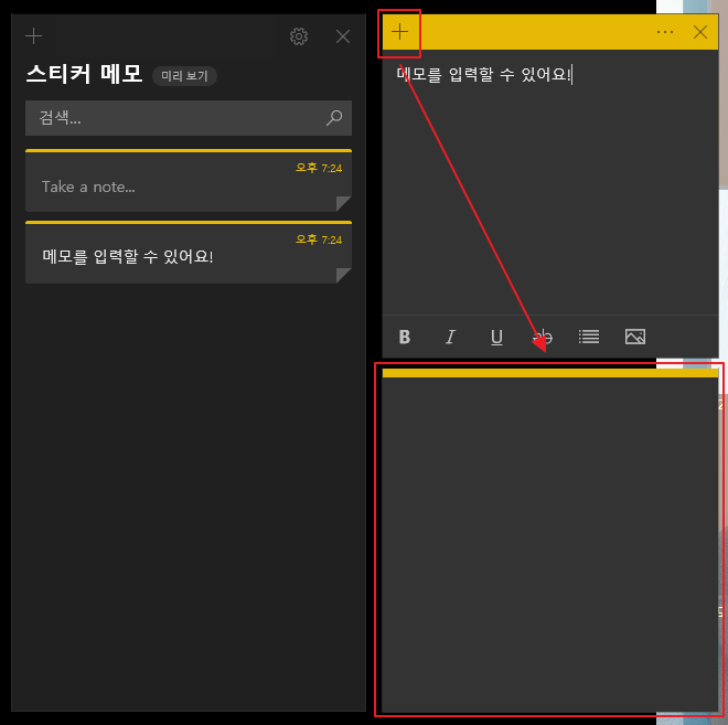 그리고 메모지에서 '+' 버튼을 누르게 되면 새로운 메모지를 추가할 수 있고 스티커 메모에도 'Take a note...' 이라는 빈 메모지가 생성되는 것을 확인할 수 있습니다.