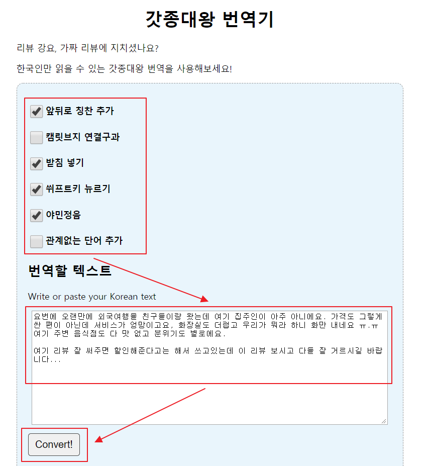 간단하게 아래 화면처럼 내가 번역할 텍스트와 이제 구글 번역기도 번역할 수 없게 만들 '필살(?) 옵션'들을 선택해서 'Convert!' 버튼을 누르면 한국인만 이해할 수 있는 글로 변경되게 됩니다.