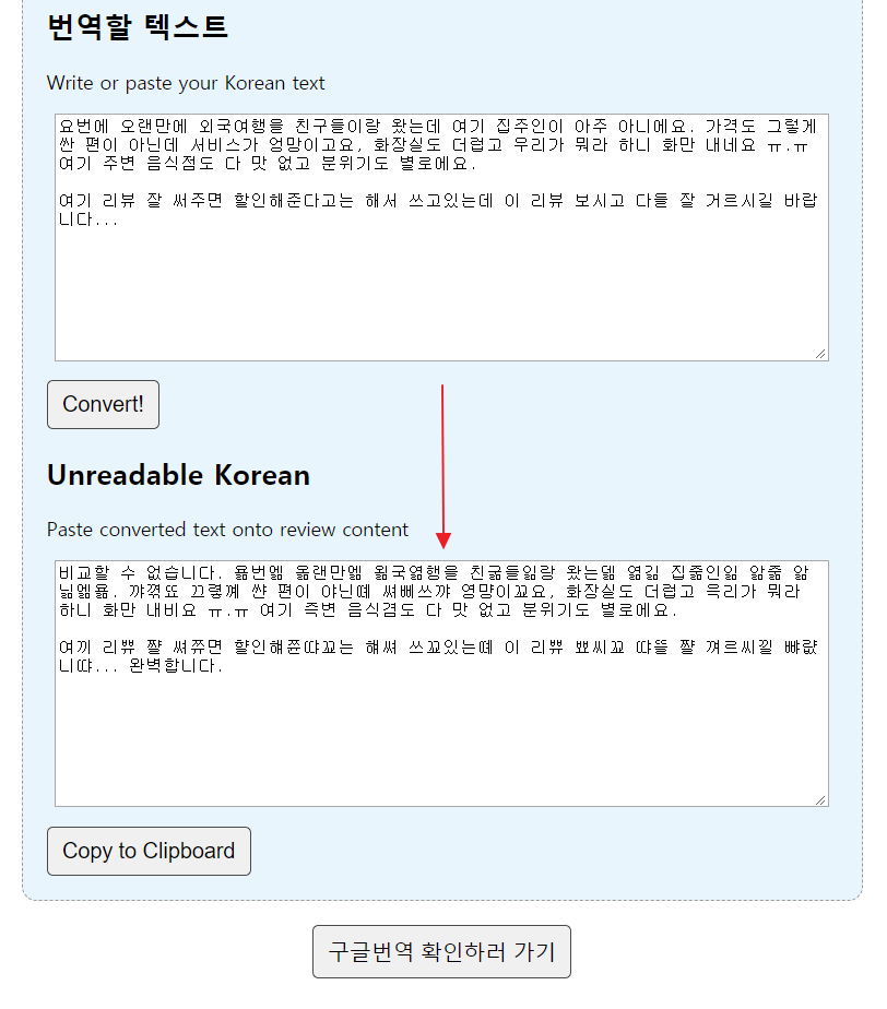 'Convert!' 버튼을 누르게 되면 다음과 같이 Unreadable Korean 란에 진정 한국인 인증이라도 필요할 정도로 한국인들에겐 모두 이해가 되지만 번역기도 번역하기 어려운 문구들이 나오게 됩니다.