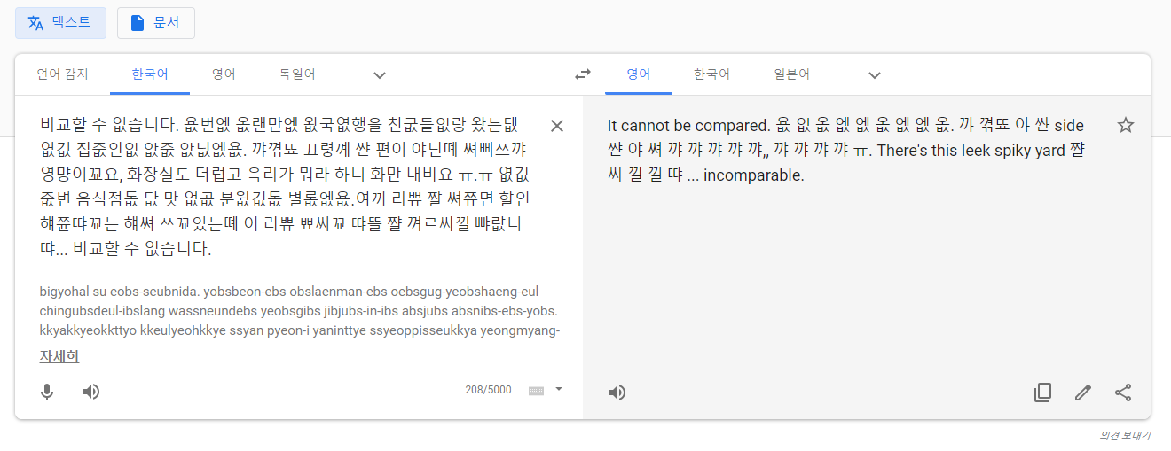 아래처럼 받침이나 쌍자음을 모두 추가시켜서 구글 번역기도 제대로 해석하지 못하게 작성하는거죠. (이 무슨 끔찍한 혼종인가...)