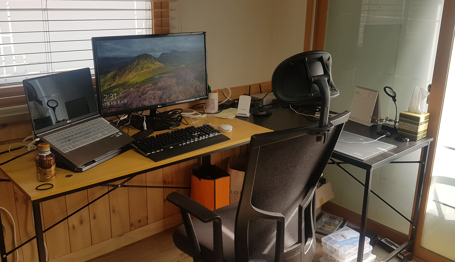 저의 사무실 책상입니다. 아 여기 사무실은 회사를 말씀드리는게 아니라 지금 부업으로 진행하고 있는 외주 일을 하기 위해 따로 원룸 공간을 구해 마련한 장소입니다.